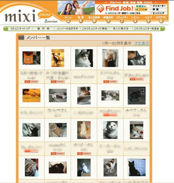 入会資格は「プロフィールのメイン画像が猫であること」そして猫以外の画像に変えたら即時退会という厳しい掟。おかげでメンバーリストは見事な猫だらけ。500人近くいるところで、たまたまマイミクの人が先頭にいたのでスクリーンショットを取っておきました。 猫好きがこれだけ集まっていますから、掲示板でも猫談義が活発に行われており、またコミュのトップ画像を掲示板で公募しているので猫の画像たくさん見ることが出来ます。