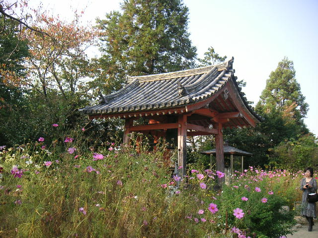 コスモス、石塔、門